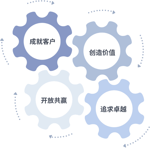 成就客户是一切决策的出发点,,,,创造价值是衡量所有工作的标准,,,,追求卓越是我们做事做人的态度,,开放共赢是我们的格局也是最终的结果。。。。价值观的齿轮环环相扣,,,推动着组织里的每个人不断向前。。。。