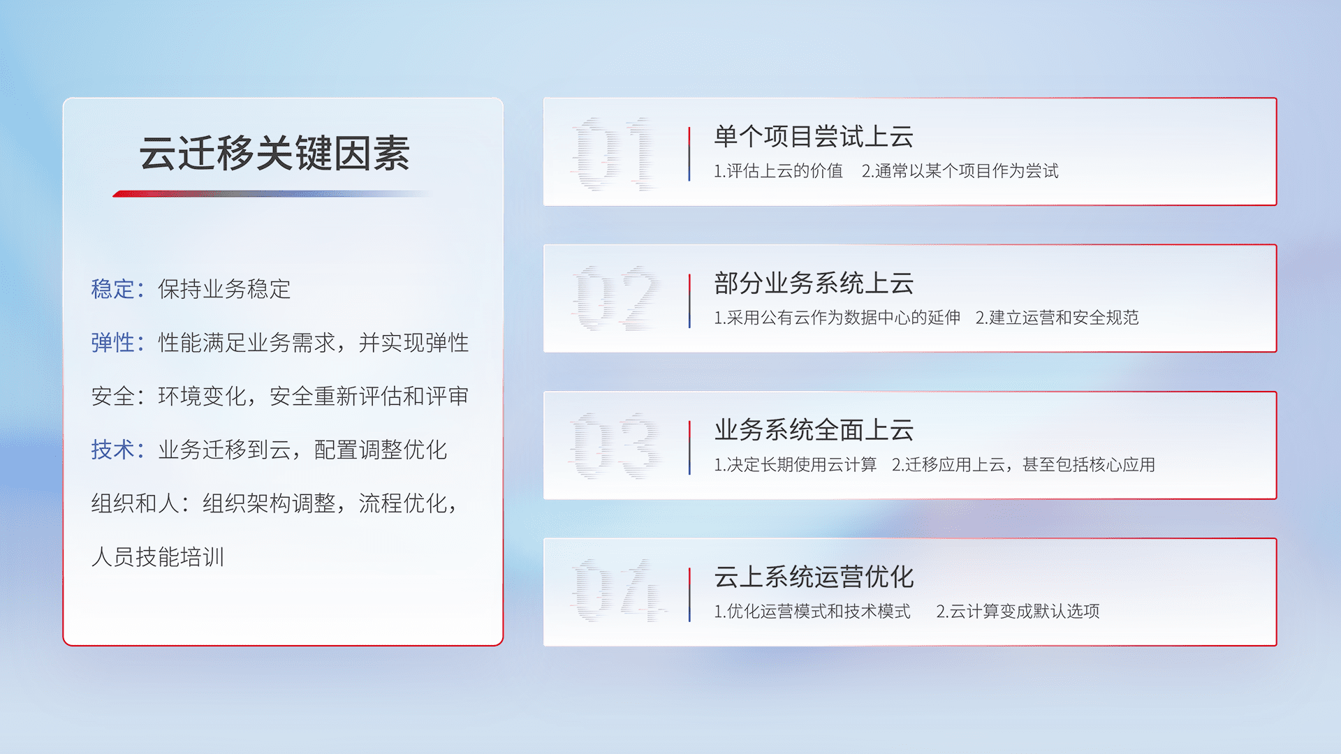 结合实际业务,,,从规划设计、、、云平台选型、、、云原生改造、、、数据迁移、、集成交付,,迁移全过程为客户识别最佳上云路径,,,,做好风险识别管理,,,设计网络架构、、、、身份权限、、、安全审计合规、、、、操作审计、、、日志审计、、、监控告警策略、、、多站点容灾设计等,,对云上基础设施进行整体规划,,,,提升IT治理水平,,以满足弹性、、高可用、、、、高性能的需求。。。。