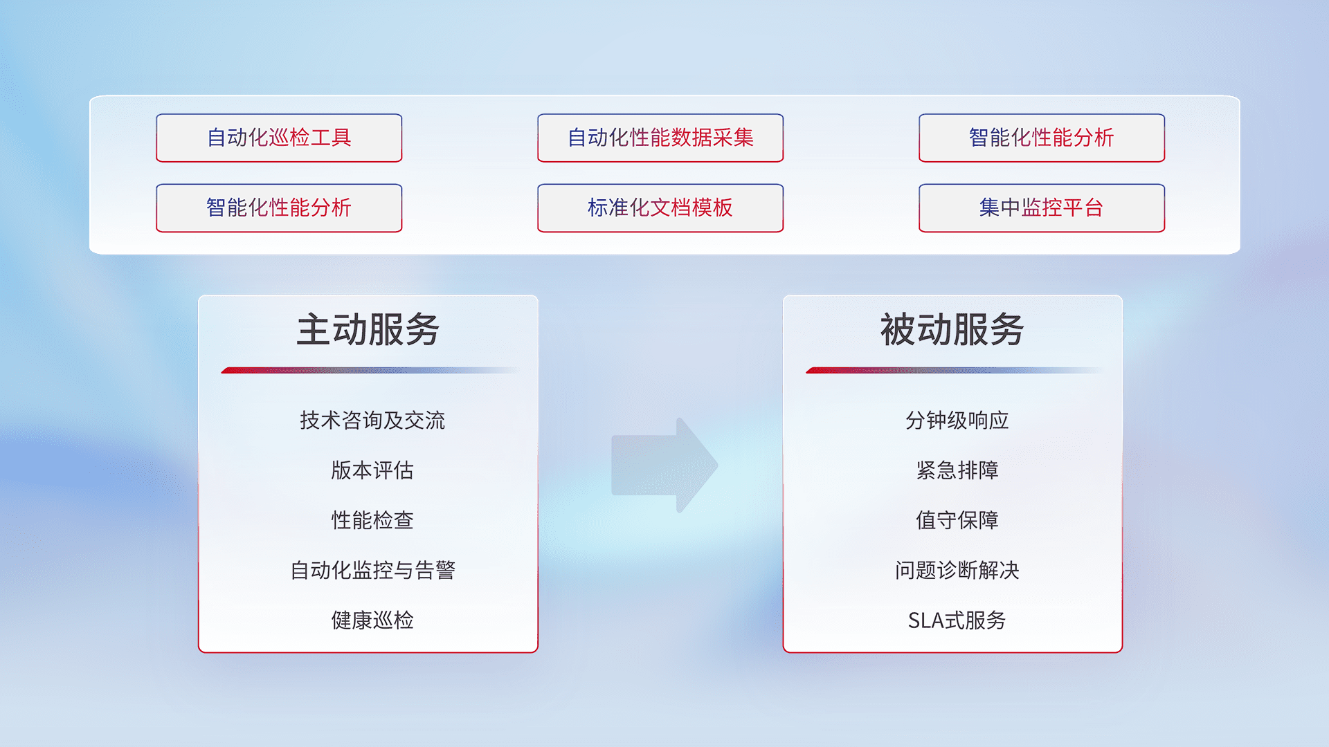 智能化工具和标准化文档,,,保障服务质量,,提供主动服务(包含技术咨询、、、版本评估、、、、性能检查、、、、自动化监控与告警、、健康巡检)和被动服务包含(分钟级响应、、紧急排障、、值守保障、、、问题诊断解决、、SLA服务)。。